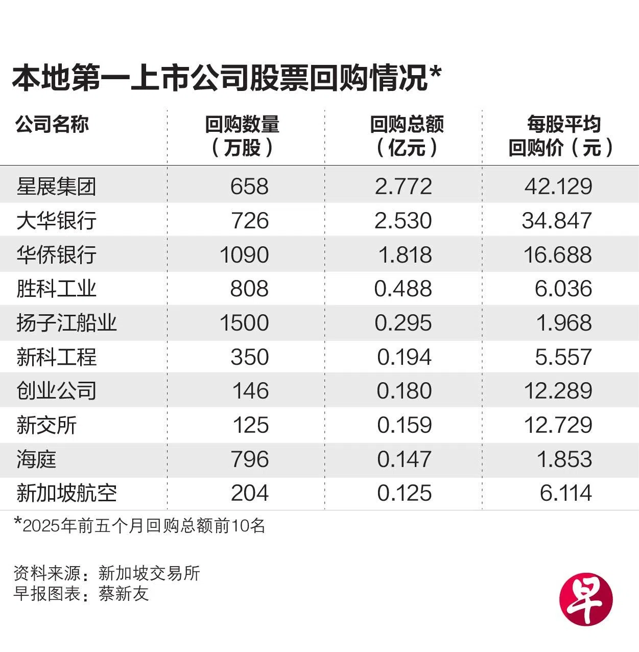 5月的股票回购额则有1亿7600万元。其中大华银行在5月7日至30日之间,以平均每股35.33元的价格回购了约1亿4400万元的股票,为当月回购金额最多的公司。其次是星展集团(1800万元,平均每股44.07元)和翱兰集团(Olam Group,640万元,平均每股0.93元)。
