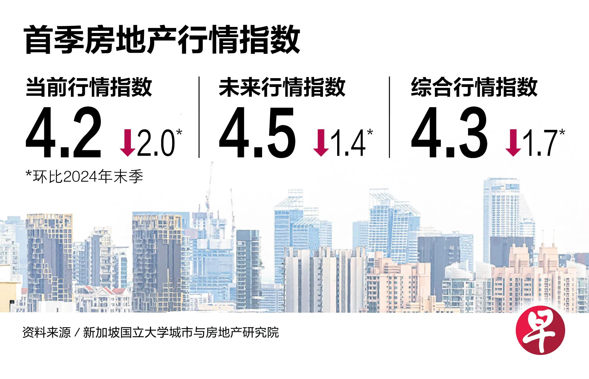 新加坡国立大学城市与房地产研究院星期四(6月5日)发布的2025年首季房地产行情指数(Real Estate Sentiment Index,简称RESI)显示,当前行情指数(Current Sentiment Index)环比下挫2.0至4.2,在三类指数中跌幅最大。