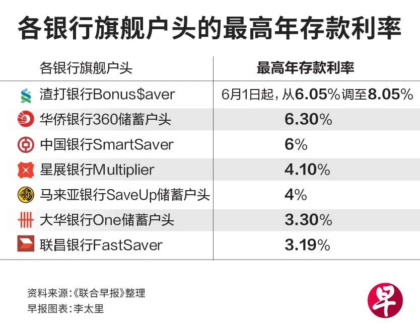 渣打银行自6月1日起,旗舰储蓄户头Bonus$aver的最高年利率,从原先的6.05%上调至8.05%。