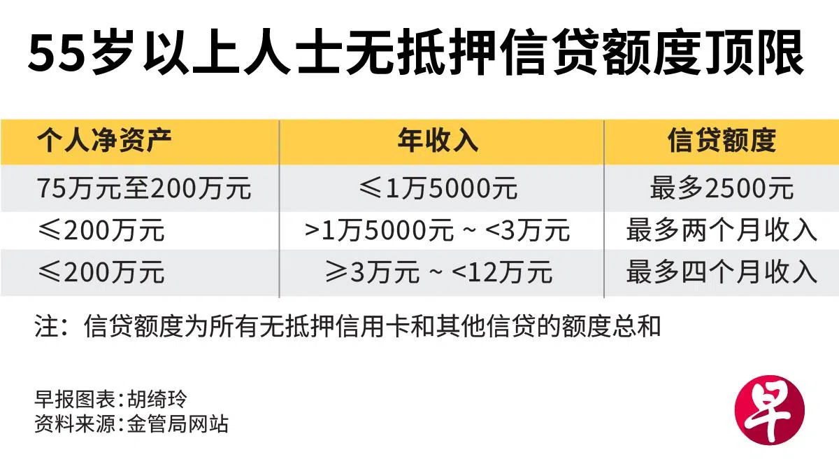 根据金管局网站,年收入不超过1万5000元、个人净资产介于75万元到200万元的55岁以上人士,信用卡额度最多2500元;年收入介于1万5000元至3万元、个人净资产不超过200万元,额度最多为两个月收入。