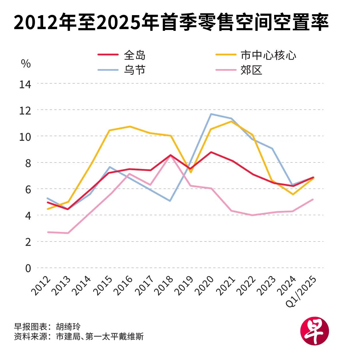 近来消费情绪趋弱、营运成本上扬,新加坡今年首季零售房地产市场的表现分化,整体空置率攀升至6.8%,环比增长0.6个百分点。