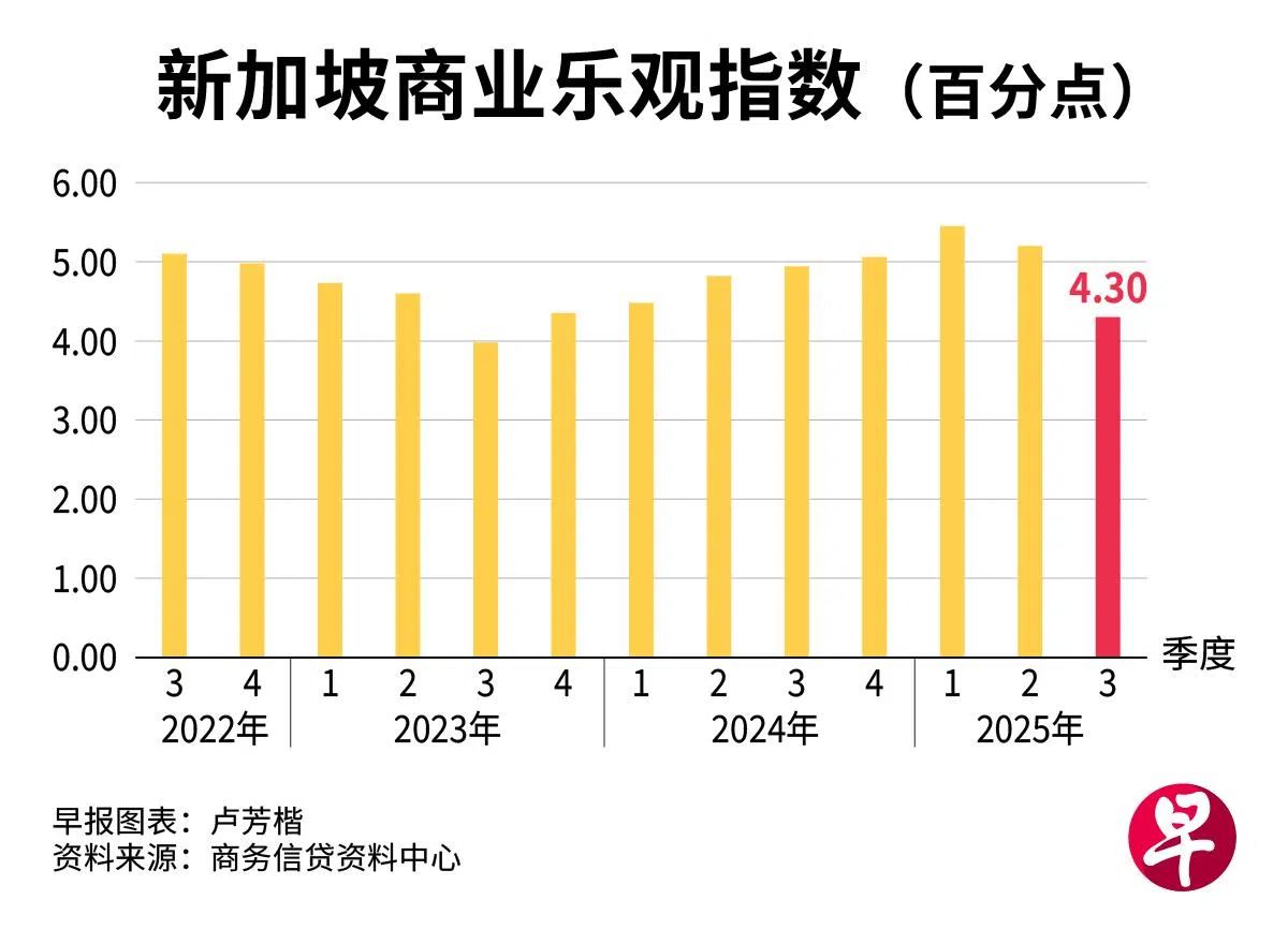 根据新加坡商务信贷资料中心(Singapore Commercial Credit Bureau,简称SCCB)星期二(6月17日)发布的商业乐观指数(Business Optimism Index),继第二季下滑后,第三季再跌至4.30个百分点,较第二季的5.20个百分点下滑,也比去年同期的4.94个百分点来得低。
