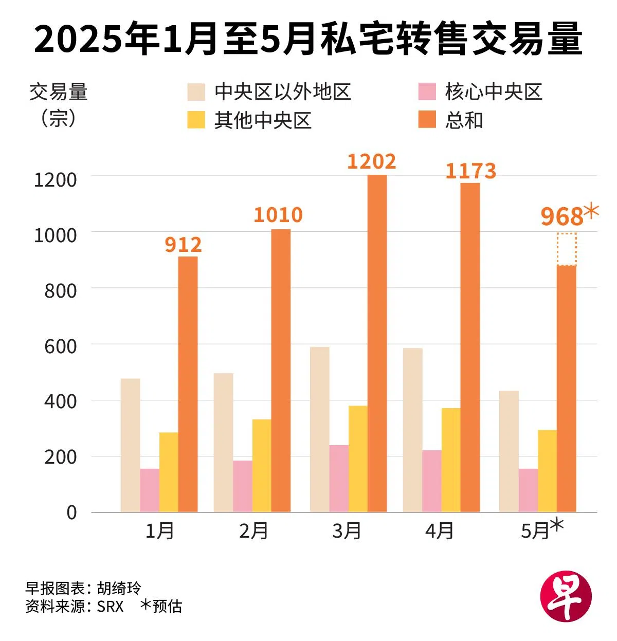 本地私宅转售市场在5月降温,交易量较上月减17.5%,从1173宗减至968宗。相较去年同期,交易量下滑20.3%。