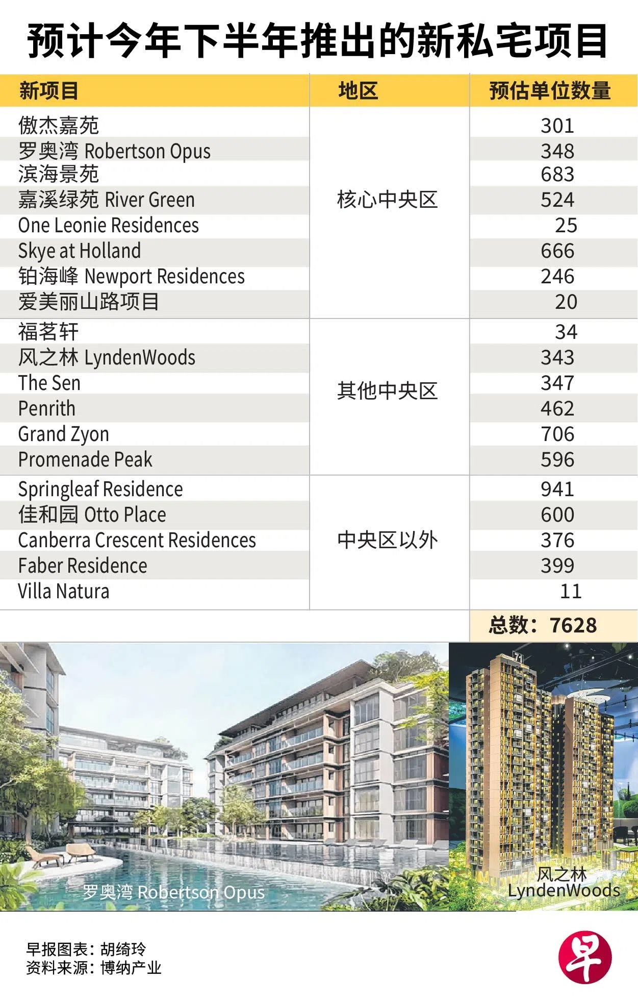 下半年可能推出的新项目,不少是位于核心中央区的高档私宅项目,例如乌节林荫道的傲杰嘉苑(UpperHouse @ Orchard Boulevard,301个单位)、罗拔申码头重新发展项目罗奥湾(The Robertson Opus,348个单位)和嘉溪绿苑(River Green,524个单位)等。