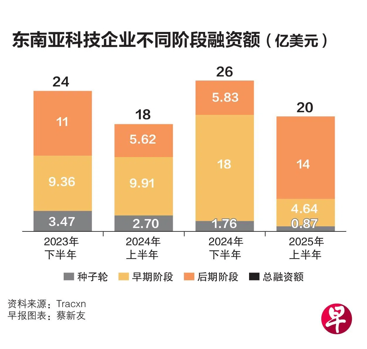 根据创业研究机构Tracxn发布的最新报告,2025年上半年东南亚科技生态系统共筹资20亿美元(约25亿5000万新元),较去年下半年减少24%,但较去年同期上升7%,显示短期虽有放缓,但长期呈回升趋势。