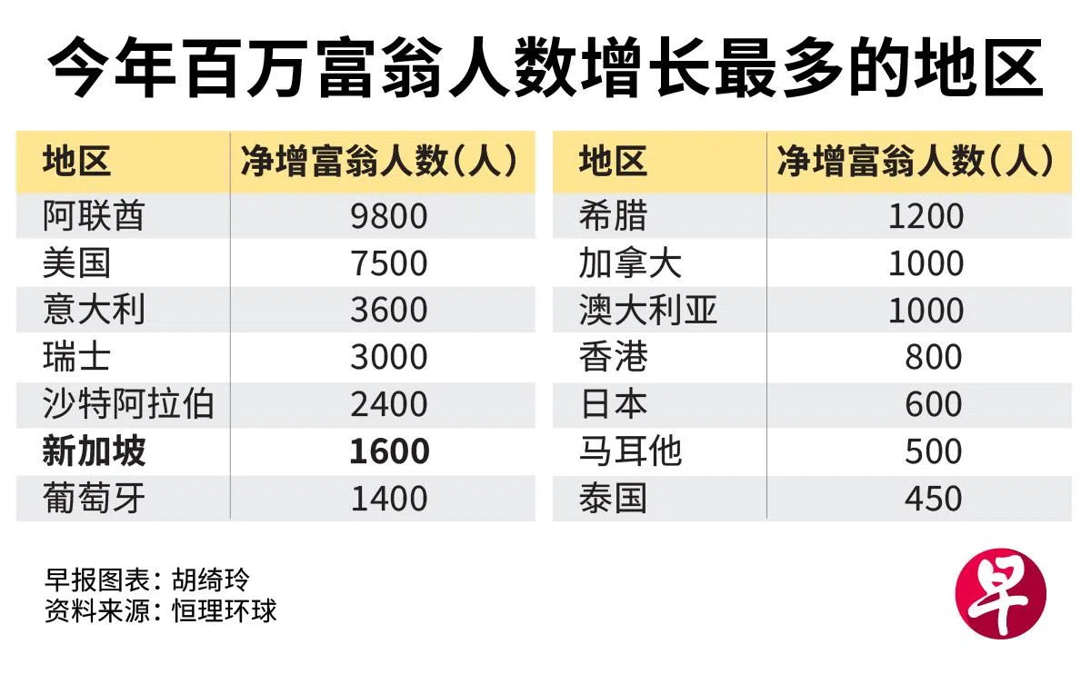 也因此,新加坡在百万富翁人数增长最快的10大地区中,名次从去年的第三滑落至第六。