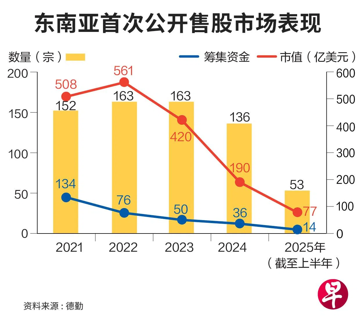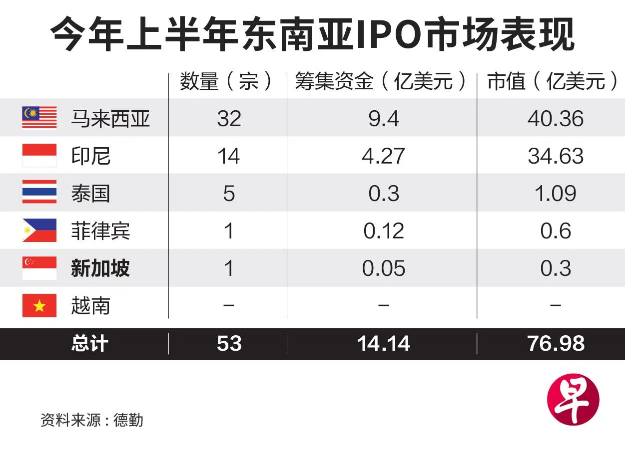 今年上半年,东南亚首次公开售股(IPO)市场共完成53宗IPO,筹集资金超过14亿美元(约17亿9276万新元)。其中仅有一宗来自新加坡,筹资500万美元。