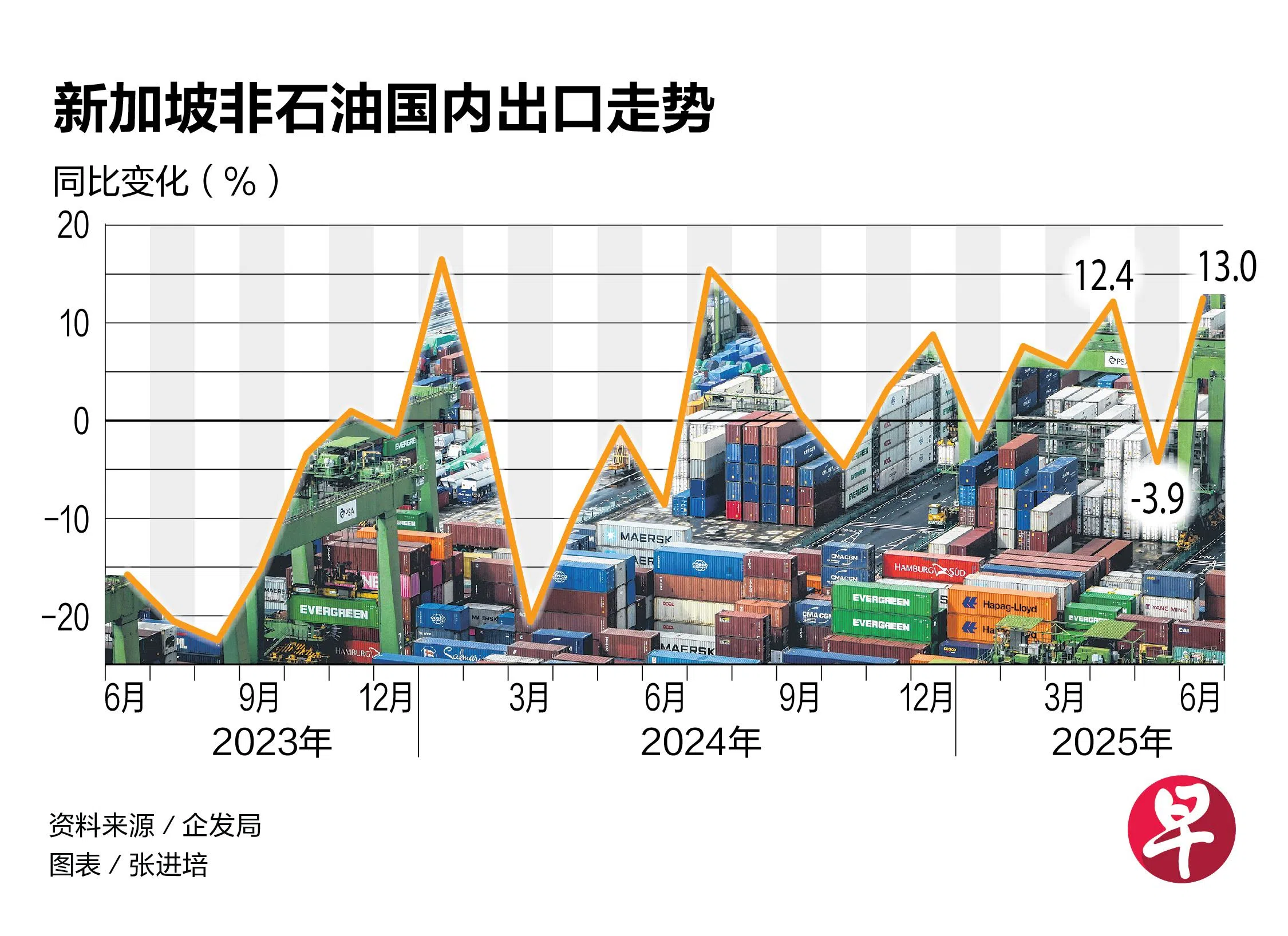 新加坡企业发展局星期四(7月17日)公布的最新数据显示,6月非石油国内出口(NODX)增长扭转了5月下跌3.9%的趋势,并攀升至近11个月以来最高点。