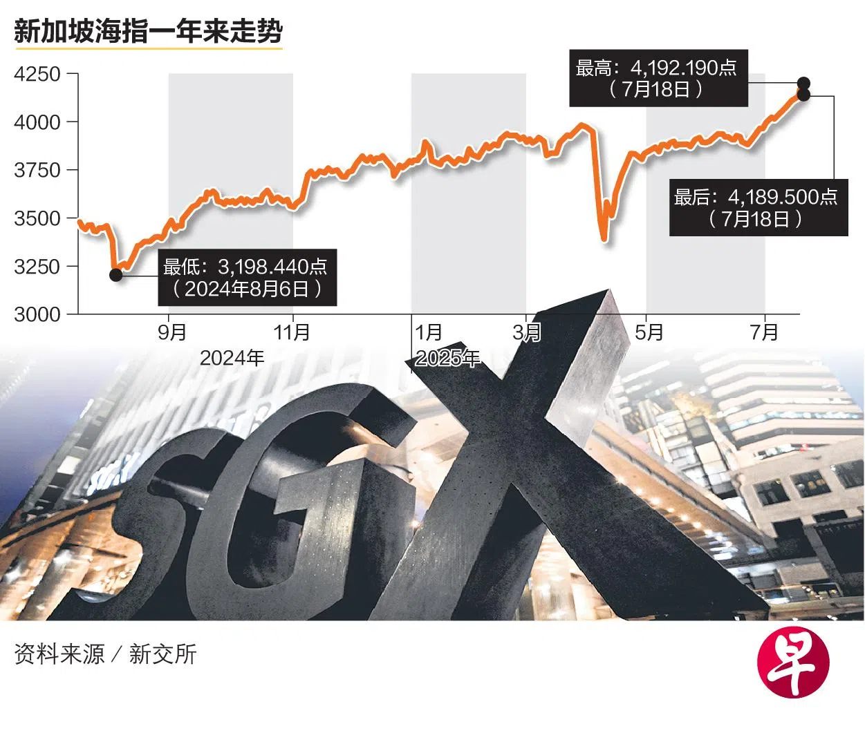 新加坡海峡时报指数突破4000点进入前所未知水平后,于过去11个交易日中几乎每天都创历史新高,不过,分析师不排除海指8月回调的可能,对股市下半年展望持谨慎乐观看法,因为关税情况有待明朗化。