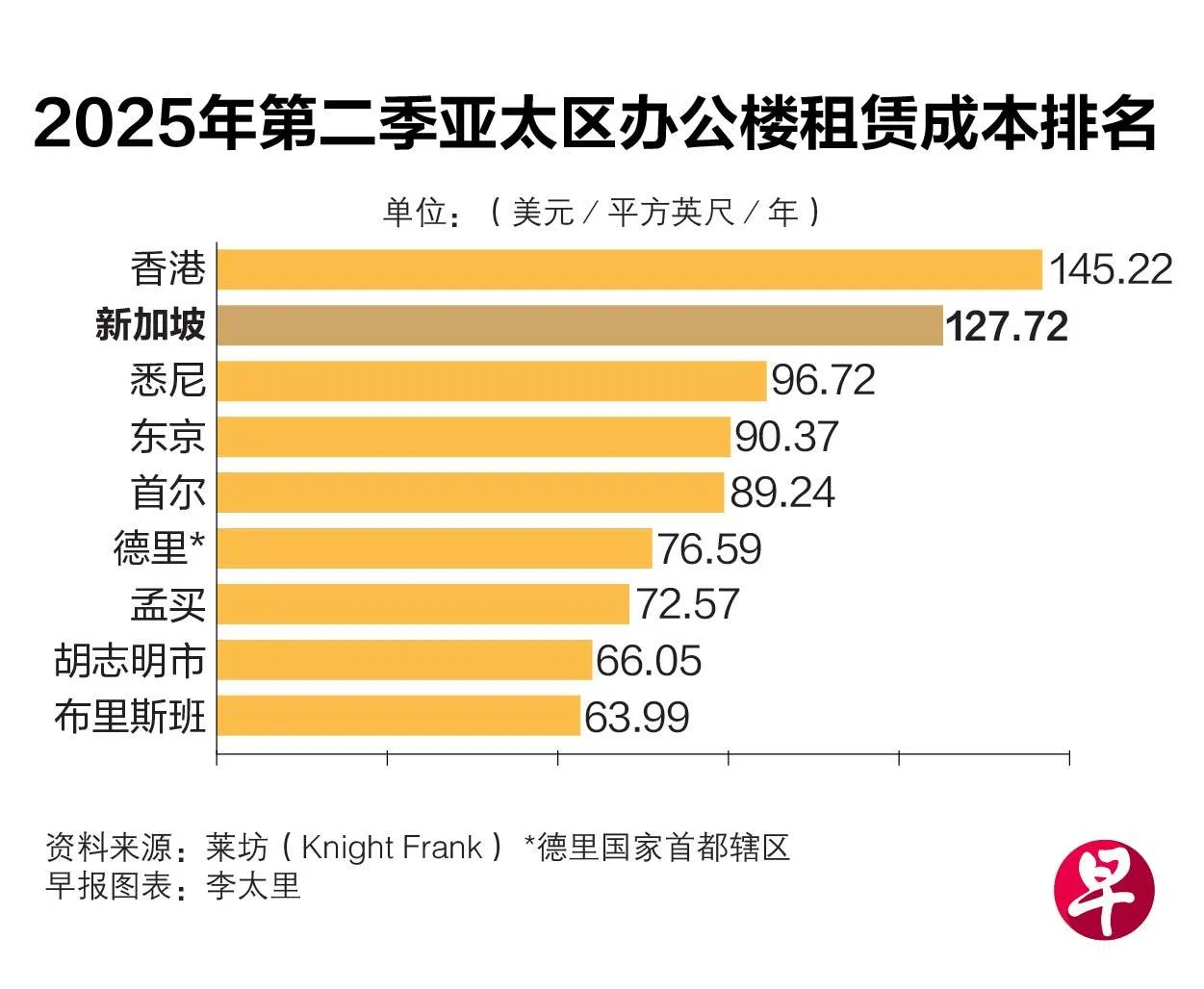 值得注意,新加坡和香港仍是亚太租赁成本(Occupancy Cost)最高的两座城市。2025年第二季,香港的租赁成本,约每年每平方英尺145.22美元(约186.45新元),新加坡则为127.72美元。