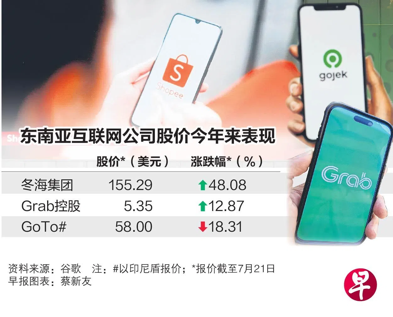 即使业绩继续改善,GoTo今年截至星期一(7月21日)的股价却是下跌18%,反观冬海涨幅高达48%,Grab也涨了13%。