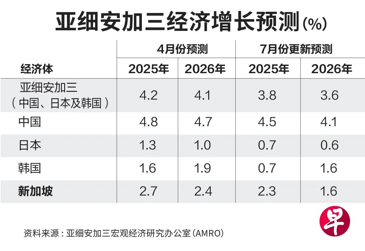 AMRO星期三(7月23日)发布的最新季度展望报告显示,亚细安加三今年经济预料增长3.8%,明年增长3.6%,这比4月份展望低了许多。由于当时报告未计入美国关税影响,AMRO预测本区域经济今年增长4.2%,明年增长4.1%,仍处于4%之上。