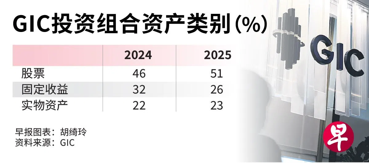 截至今年3月底,证券占GIC投资组合51%,较前一财年增加五个百分点,固定收益减少六个百分点至26%,包括房地产和基础设施的实物资产,略增一个百分点至23%。