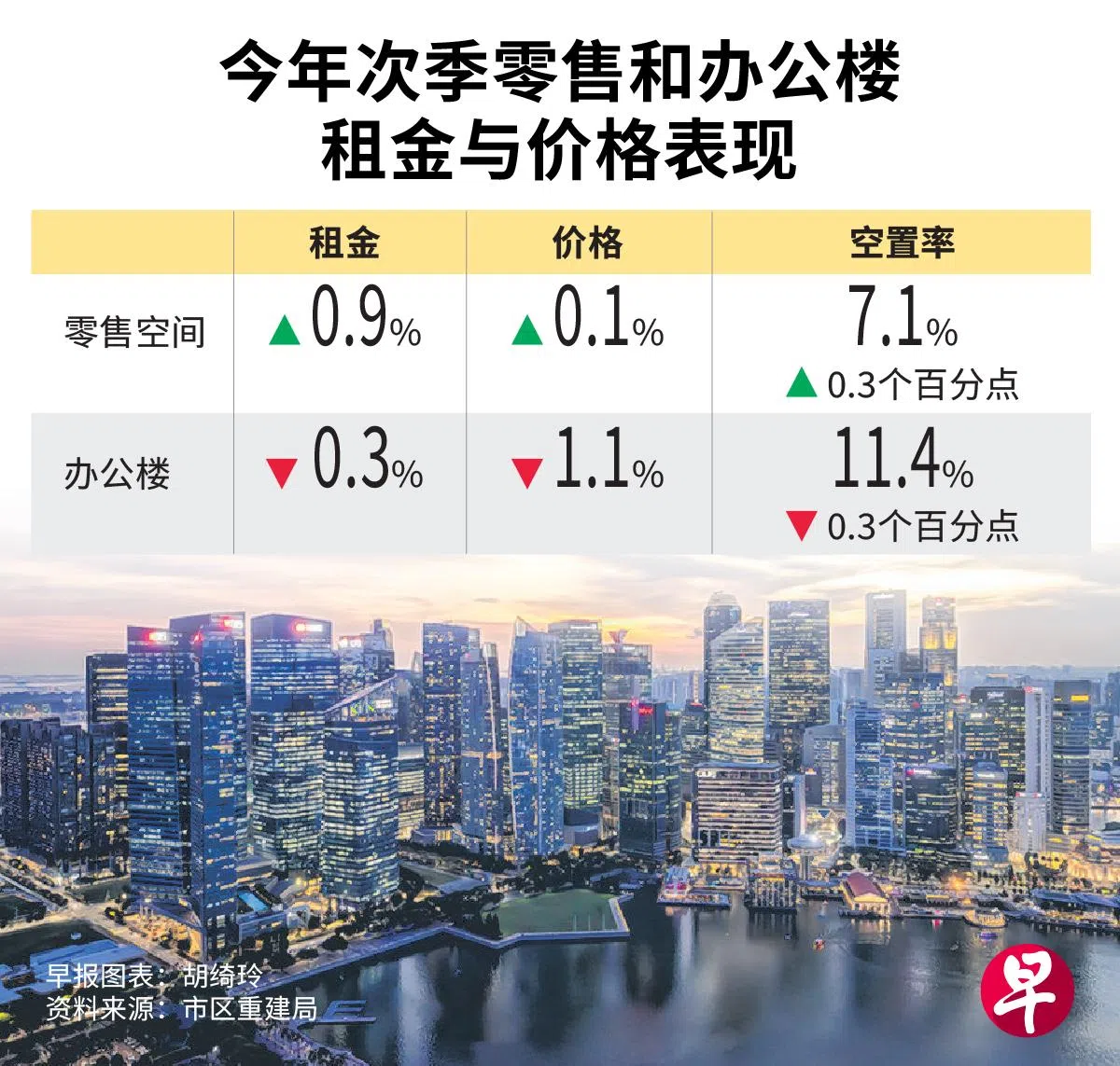 办公楼空置率下降0.3个百分点至11.4%;零售空间则相反,空置率上升0.3个百分点至7.1%,但增幅较第一季的0.6%有所收窄。