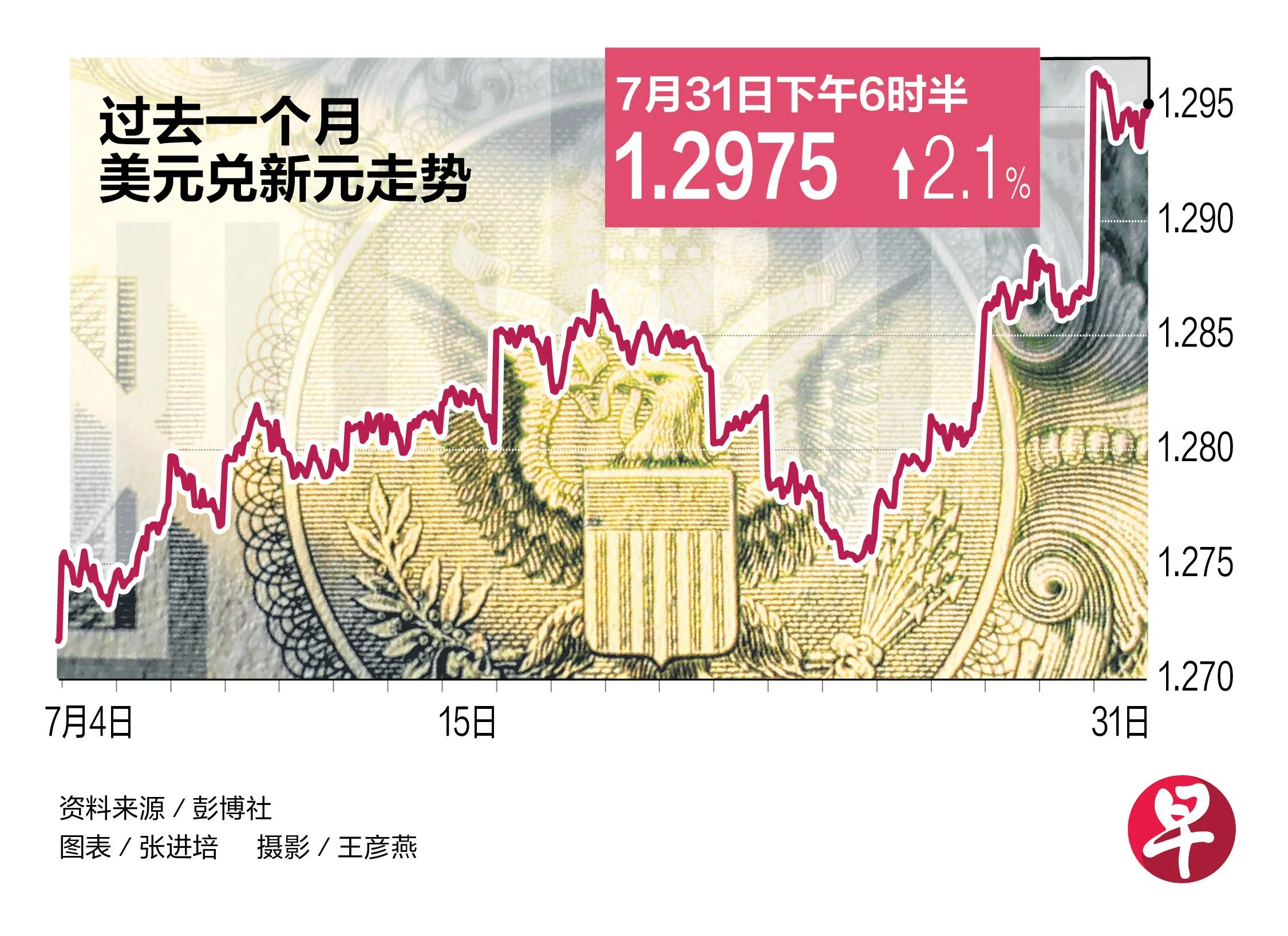美国联邦储备局连续五次会议维持利率不变,将联邦基金利率目标区间维持在4.25%至4.50%之间,推动美元上涨,美元兑新元汇率回升到1.29以上。美元有望取得今年来首次月度涨幅。