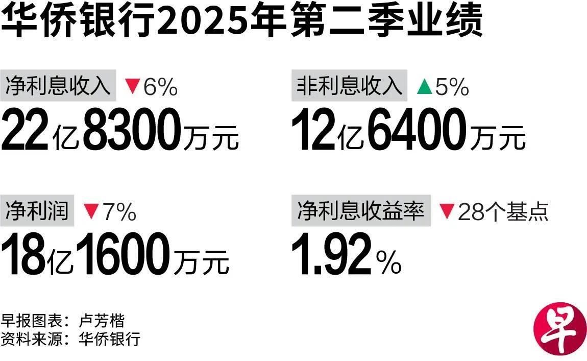 华侨银行第二季净利息收益率为1.92%,同比缩减了28个基点,导致净利息收入同比减少6%至22亿8300万元。
