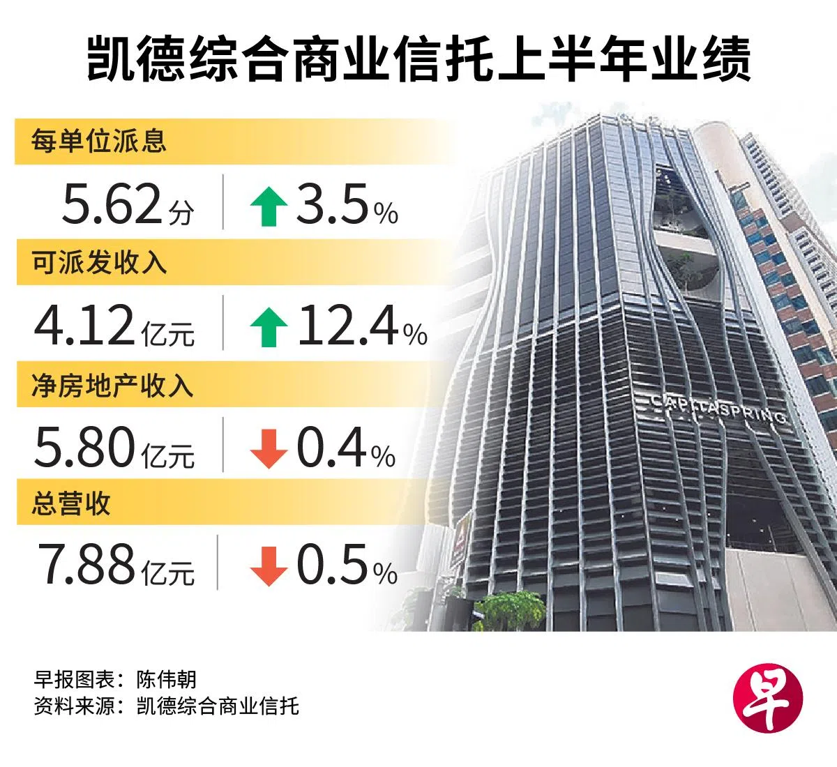 与此同时,根据最新发布的业绩,爱雍·乌节(ION Orchard)收入贡献上升,使信托本财年上半年可派发收入同比增加12.4%,达4亿1189万元。信托上半年每单位派息(DPU)为5.62分,比去年同期多3.5%。它预计在9月18日派发股息。