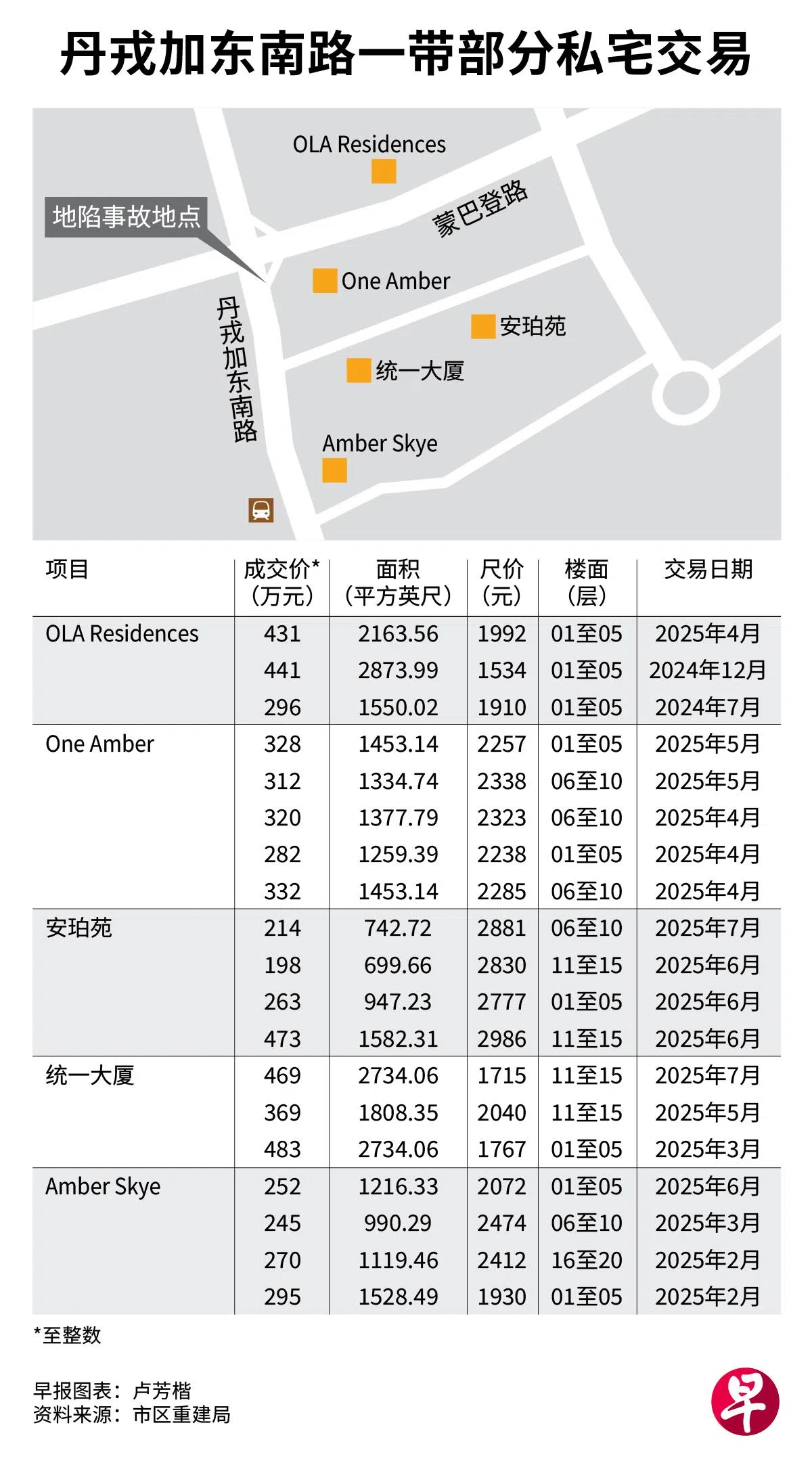例如,距离地陷处仅几步之遥的四五个私宅中,One Amber是最靠近的一个。这个于2010年建成的永久地契项目,共有562个单位,今年来有13个单位转售,最近一个单位转售价为328万元,相当于尺价2257元。
