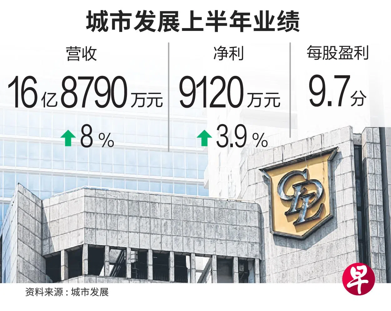 城市发展星期三(8月13日)开市前公布截至今年6月底的上半年业绩,营收同比增加8%至16亿8790万元。董事会建议派发每股3分特别中期股息,高于去年的2分。
