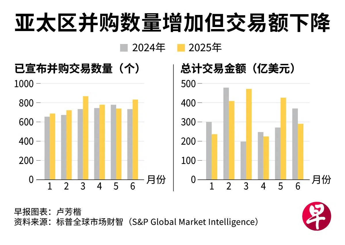 根据标普的数据,亚太区并购交易总金额今年6月同比减少了21.3%,为288亿7000万美元(约372亿新元);同时,并购交易数量达到834个,同比增13.2%。