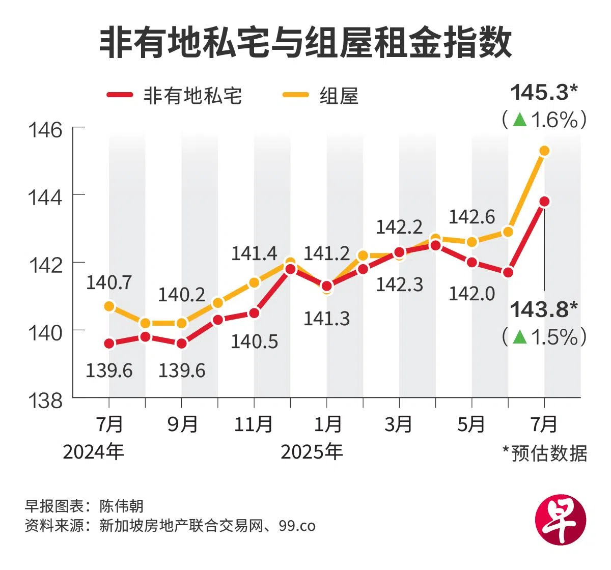 外籍人士迁居至新加坡、家庭赶在开学前安顿下来,以及部分租约于年中到期,共同形成季节高峰,使新加坡7月份租赁市场火热,租金环比上扬1.5%。