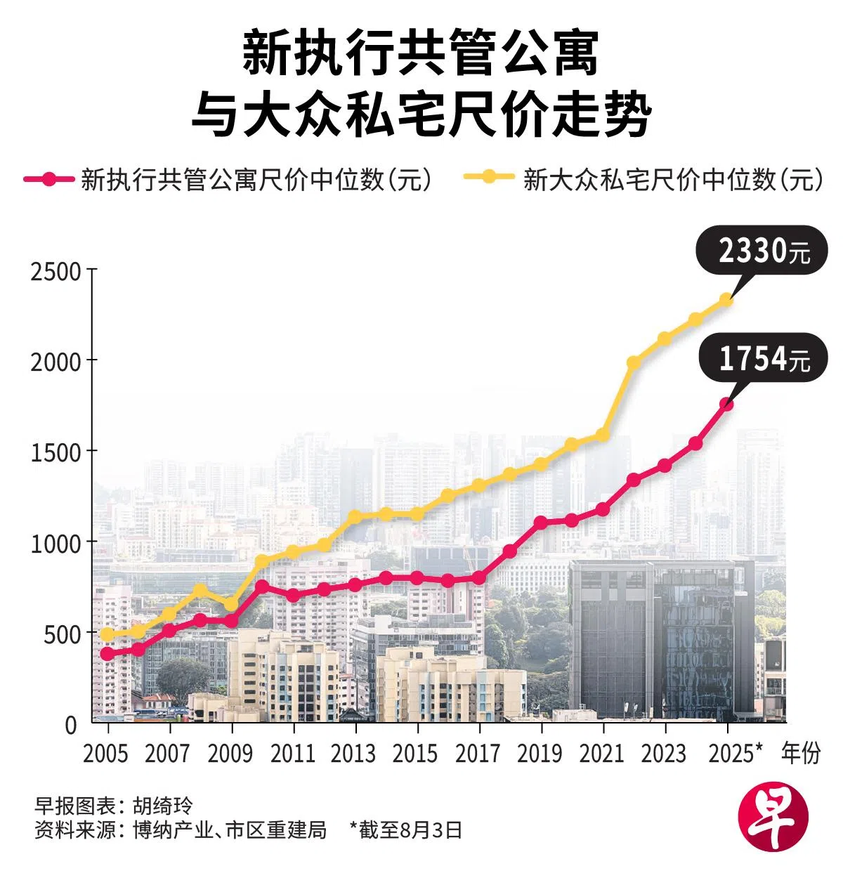 根据博纳产业(PropNex)提供给《联合早报》的数据,今年截至8月3日,新EC和位于中央区以外(OCR)的大众化私宅开盘尺价中位数分别为1754元和2330元,两者相差33%。