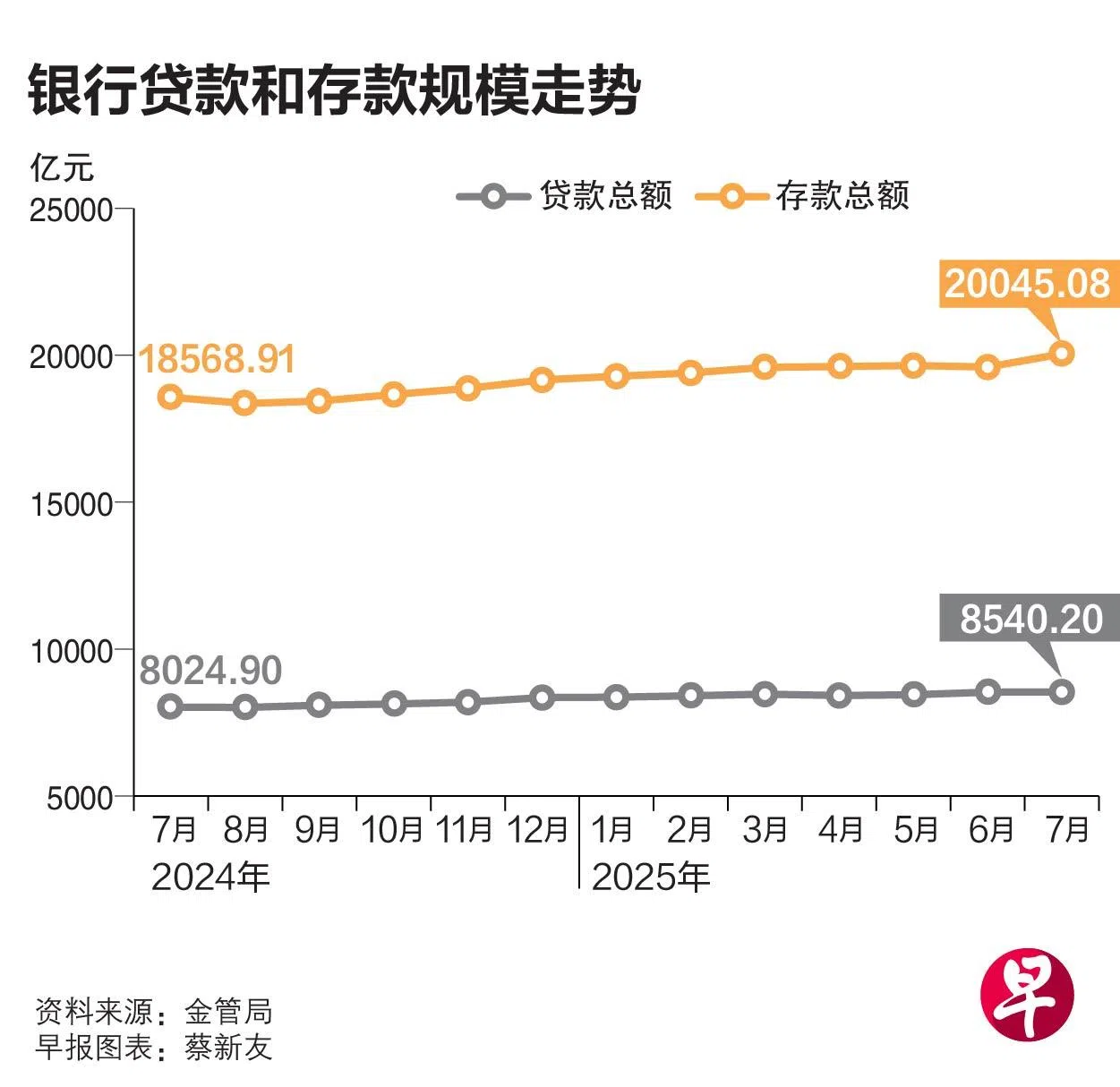 金管局同日公布的存款预估数据显示,我国7月份存款规模为2万亿元,环比增加2.3%,同比增加7.9%。