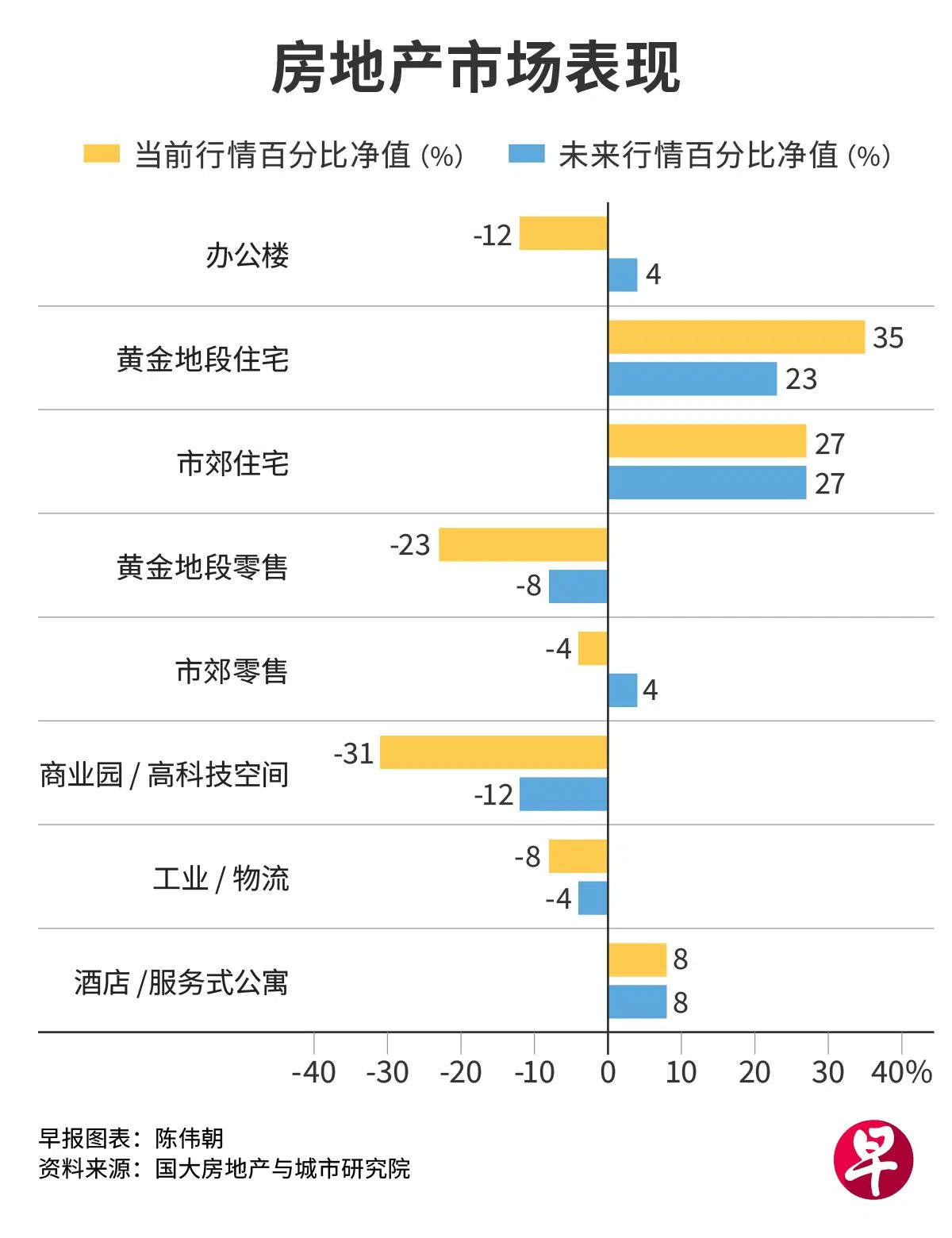 然而,调查也发现,发展商对所有房地产类别未来六个月的看法都较积极,尤其是市郊住房。市郊房地产的未来行情百分比净值(future net balances,看好减去不看好受访者的百分比)达27%。