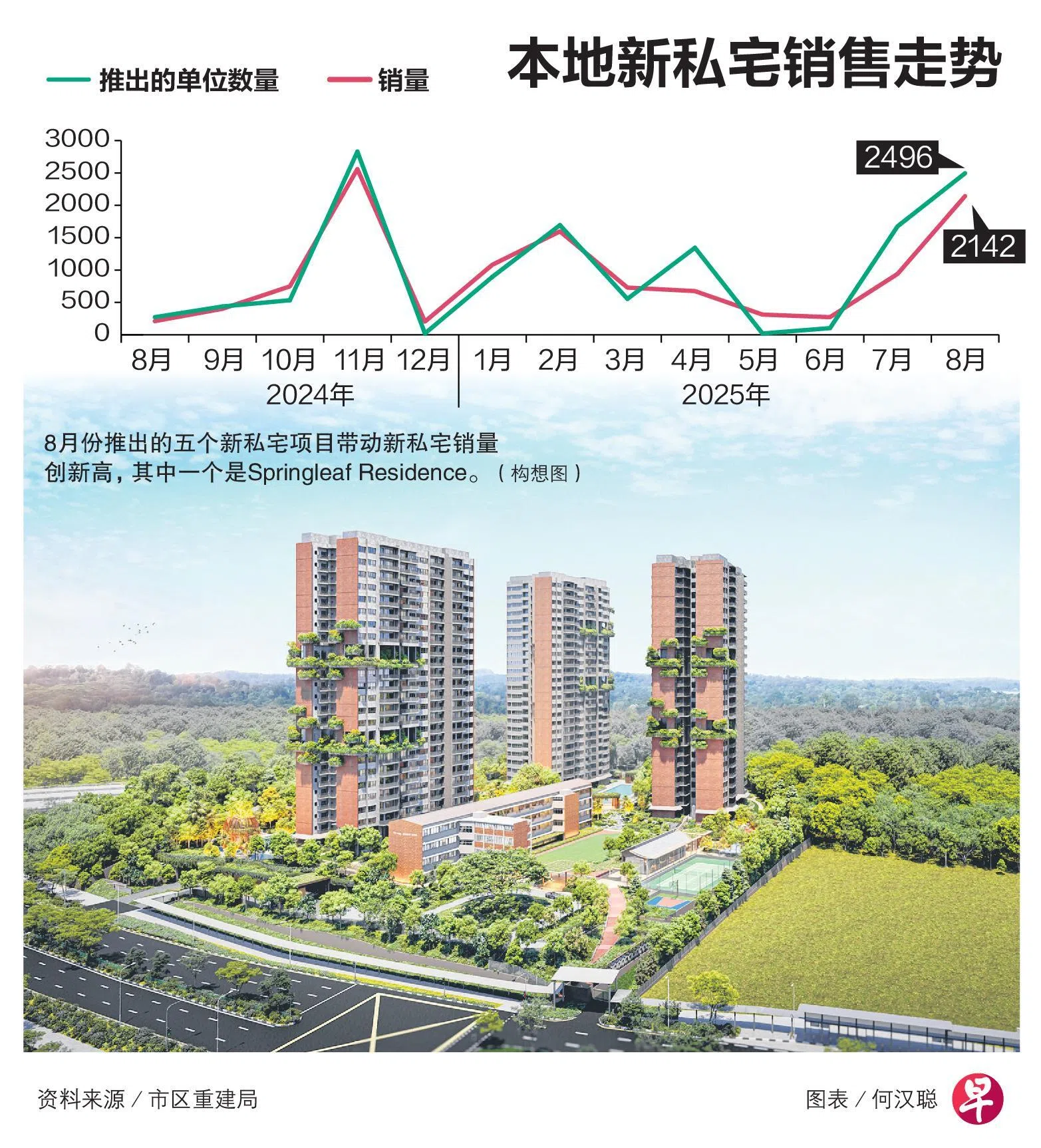 市区重建局星期一(9月15日)公布的预估数据显示,不包括执行共管公寓(EC),新私宅的8月销量环比上升128%,高于7月份售出的940个单位,更远远超过去年同期售出的211个单位。