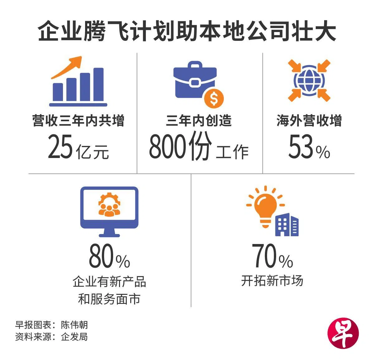 自新加坡企业发展局推出企业腾飞计划以来,首七批共80家企业参与其中,三年内总营收增加了25亿元,增幅达37%。这些企业的海外营收大增53%至10亿元,同时为新加坡人创造约800份工作岗位。