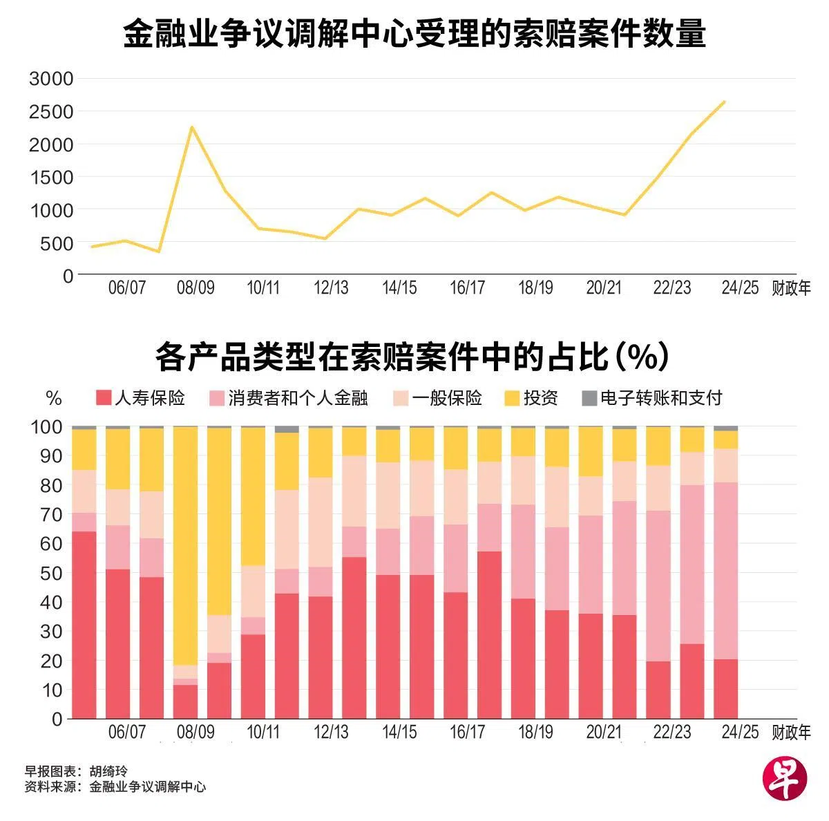 FIDReC还指出,服务相关投诉在过去十年持续上升,2019/2020财年占所有索赔案件的16%,此后保持在12%至15%之间。“随着金融机构扩大自助服务和线上平台,由于消费者期望提高、数码化服务面临挑战以及人性化互动减少,服务相关投诉未来可能继续上升。”
