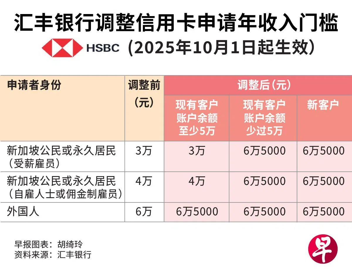 汇丰现有客户,如果账户的日均总余额(total relationship balance)不到5万元,10月1日起申请新的信用卡,年收入要求会提高到6万5000元;相关调整不影响客户已经持有的信用卡。