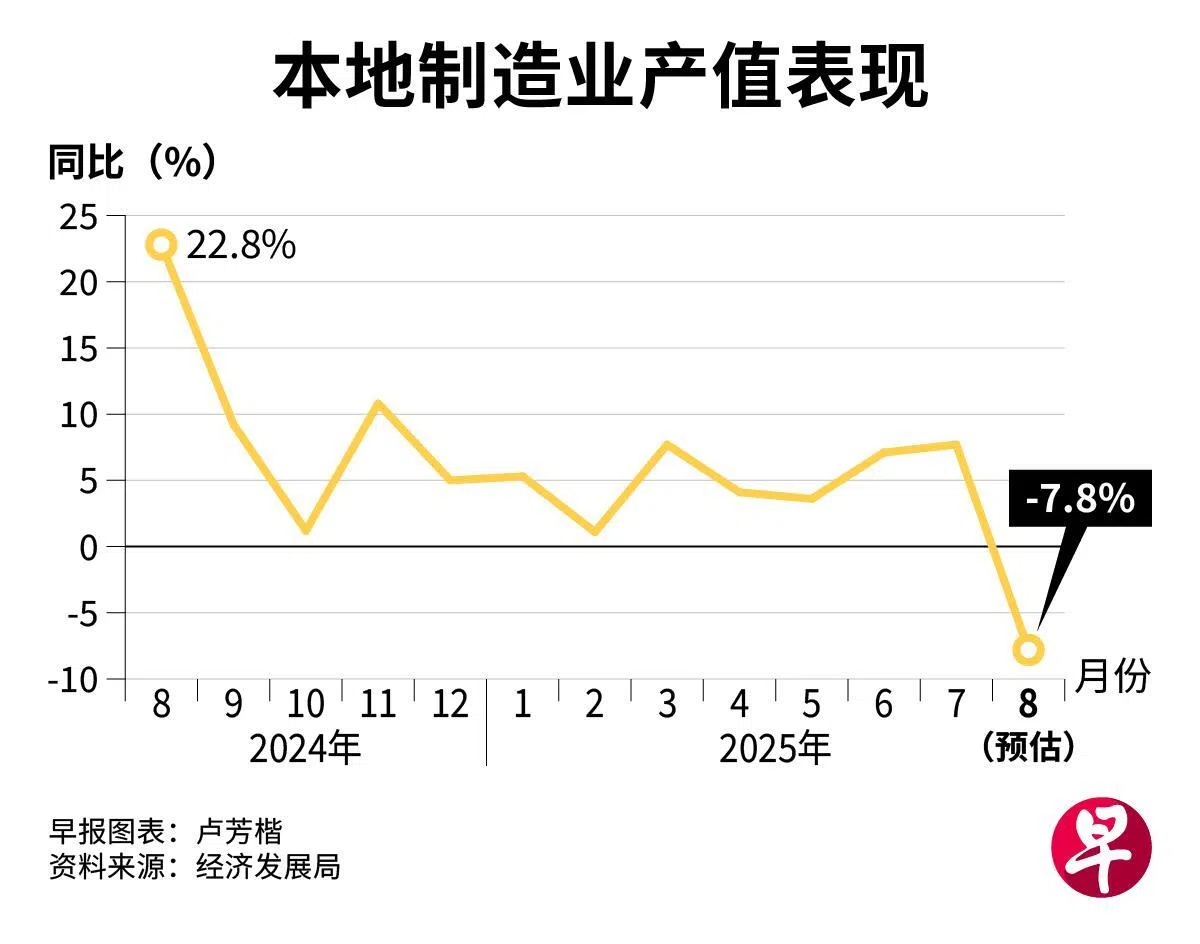 新加坡8月份制造业产值同比下滑7.8%,结束此前连续13个月的增长,创下自2024年3月以来最大跌幅。