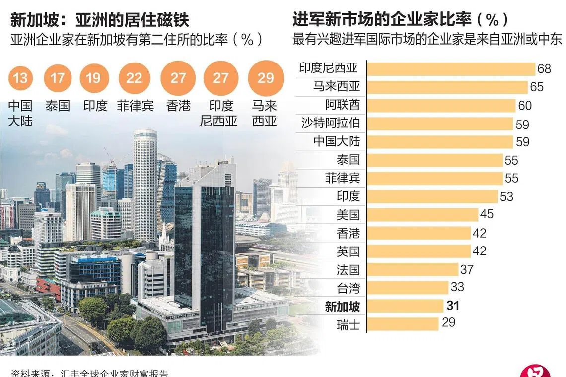 报告也指出,新加坡吸引最多来自邻国的企业家,尤其是印度尼西亚(47%)和马来西亚(38%),这加强新加坡在财富方面的区域门户角色。另外,近三分之二(63%)的新加坡企业家在多个市场居住,高于全球平均(56%),反映新加坡企业家普遍拥有广泛的国际网络与接触面。