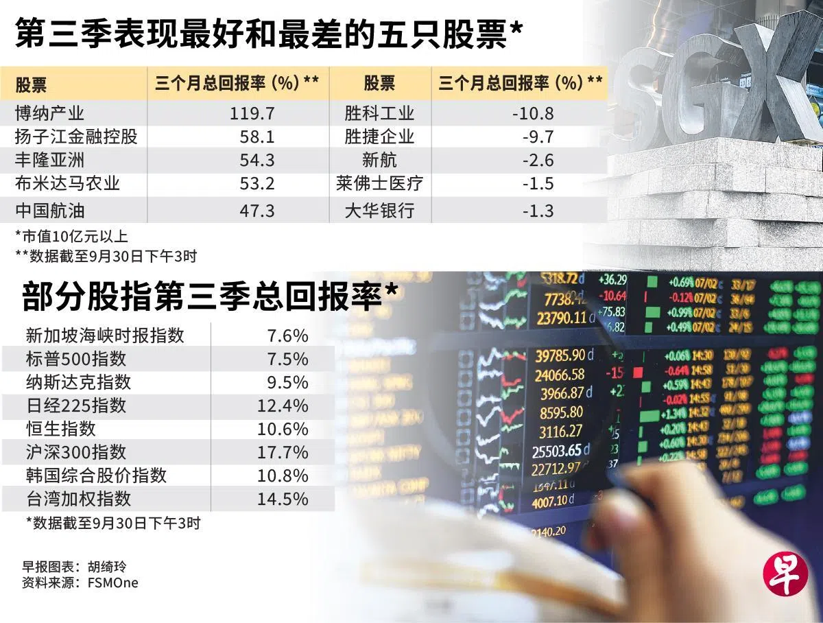 在市值超过10亿元的股票中,第三季表现最佳的是博纳产业(+119.7%)、扬子江金融控股(+58.1%)和丰隆亚洲(+54.3%)。相较而言,表现不佳的股票跌幅不大,跌幅最大的胜科工业下跌10.8%,其他下跌股还包括胜捷企业和新航等。