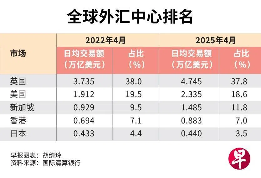 新加坡巩固全球第三大外汇中心的地位,仅次于英国和美国,今年4月时的日均交易额为1.485万亿美元(约1.92万亿新元),较2022年4月时大幅度增加60%。