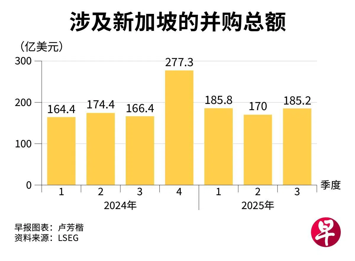 市场分析公司LSEG提供给《联合早报》的数据显示,今年第三季本地相关的并购交易宣布总额达到185亿美元(约240亿新元),比第二季增加9.0%,同比则增长11.3%。