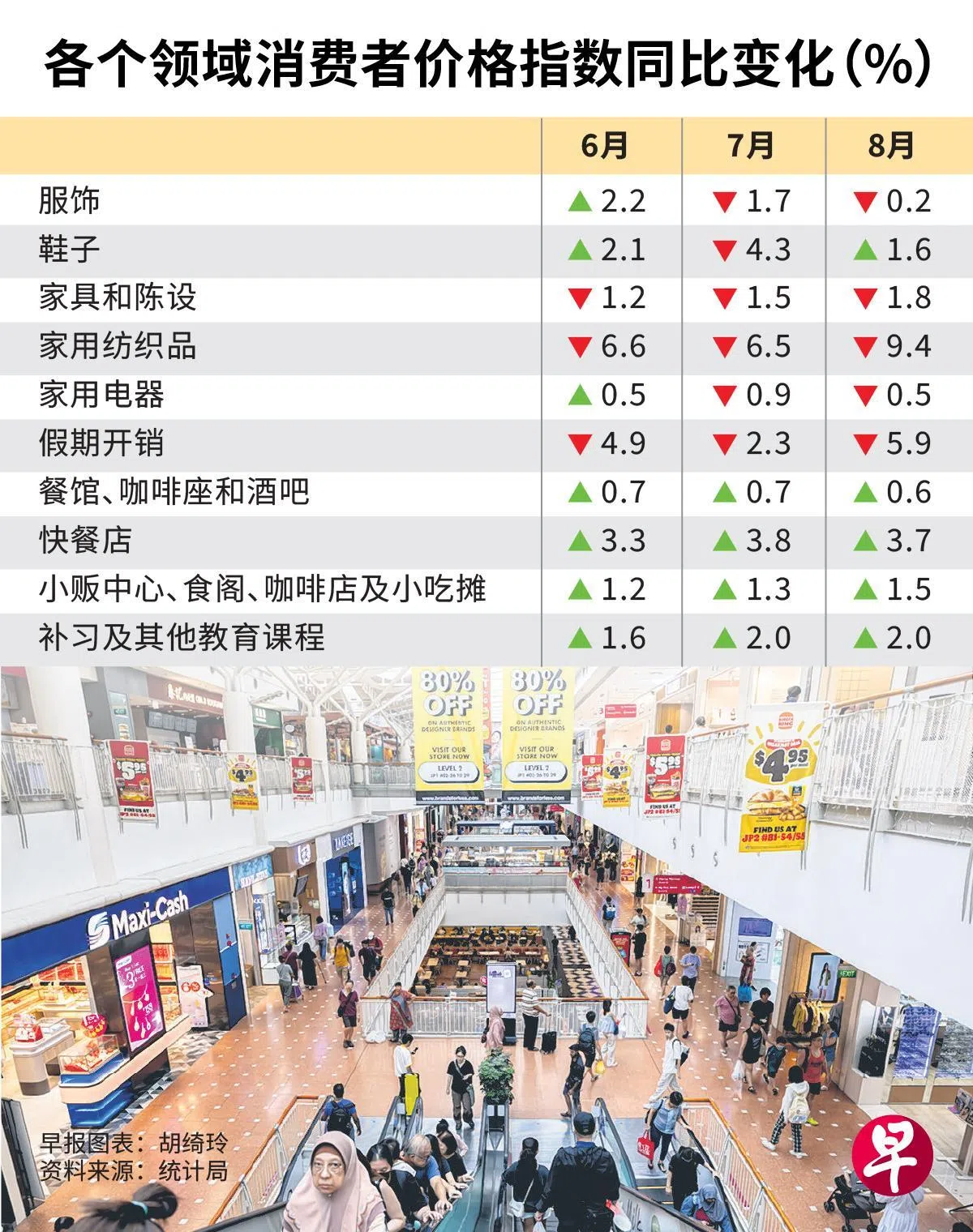 另一方面,今年首八个月,餐馆、咖啡座、酒吧、快餐店、小贩中心、食阁、咖啡店和小吃摊的价格持续同比上涨。其中,快餐店的价格在5月至8月期间连续四个月同比升幅超过3%。