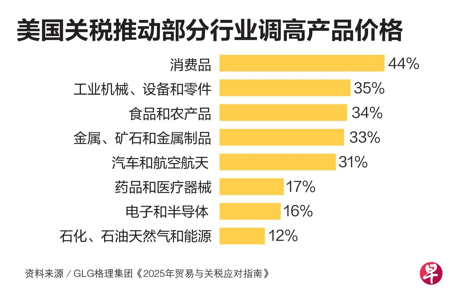 GLG调查也发现,51%日本出口商和26%亚细安出口商已上调产品价格;亚太44%消费品和35%工业机械、设备和零件业者通过提价应对关税。
