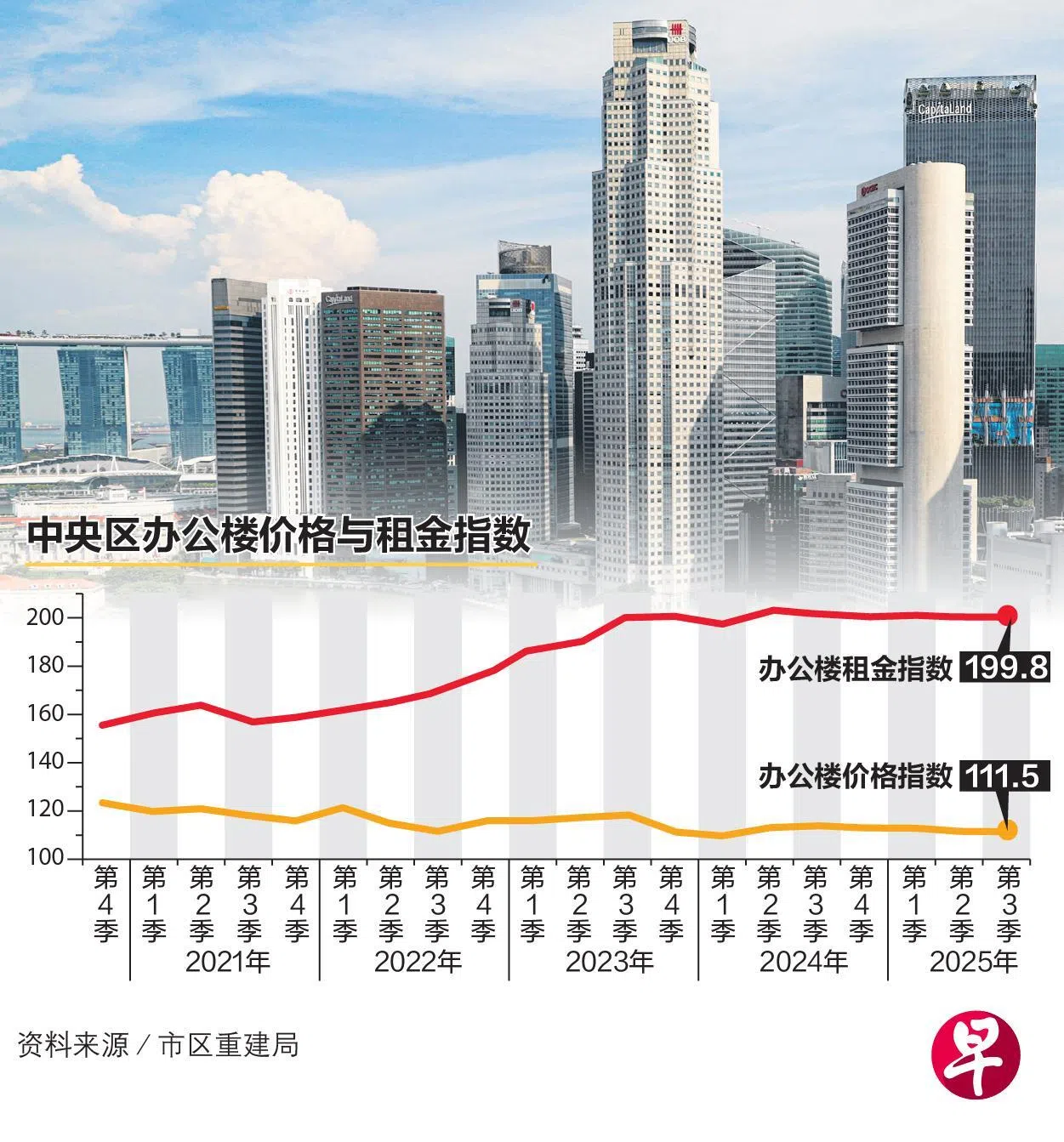 市建局的中央区办公楼价格指数也连续四季出现下降,第三季环比价格下行0.2%,比次季1.1%的跌幅大幅收窄。世邦魏理仕(CBRE)东南亚研究主管宋明蔚认为,这是办公楼资本市场触底的信号。