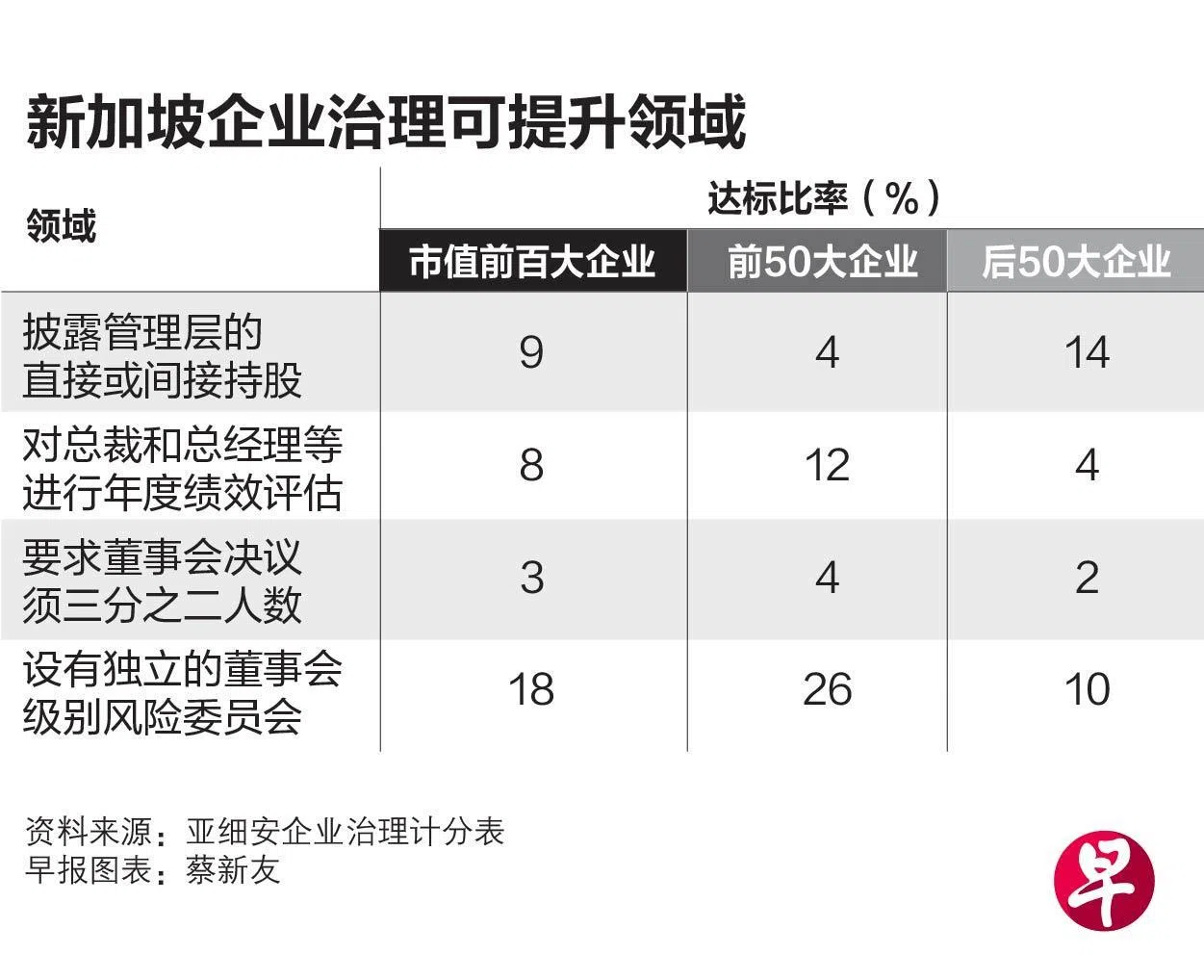 新加坡企业在派息时间、董事会议频率 ,以及交易透明度等方面落后于亚细安邻国。其中,本地企业在高管持股披露率方面表现最差,仅不到一成的企业公布有关信息。