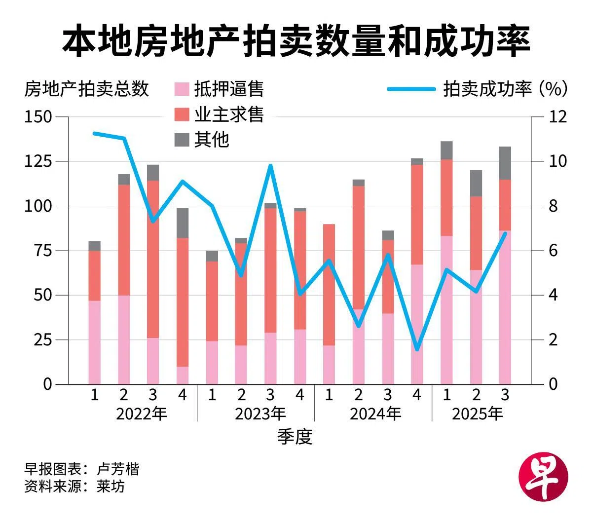 房地产咨询公司莱坊(Knight Frank)公布的最新数据显示,第三季拍卖房地产总数同比增加53.5%至132个,环比则上升10%。这些房地产包括重复拍卖的房地产。