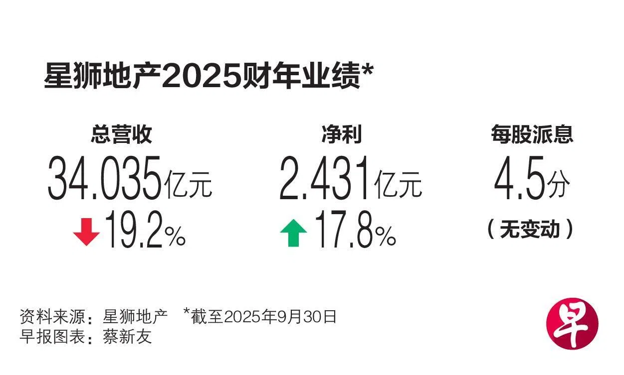 星狮地产(Frasers Property)星期五(11月14日)发布截至9月30日的2025财年半年及全年业绩文告,并宣布拟派发每股4.5分股息,与去年持平。