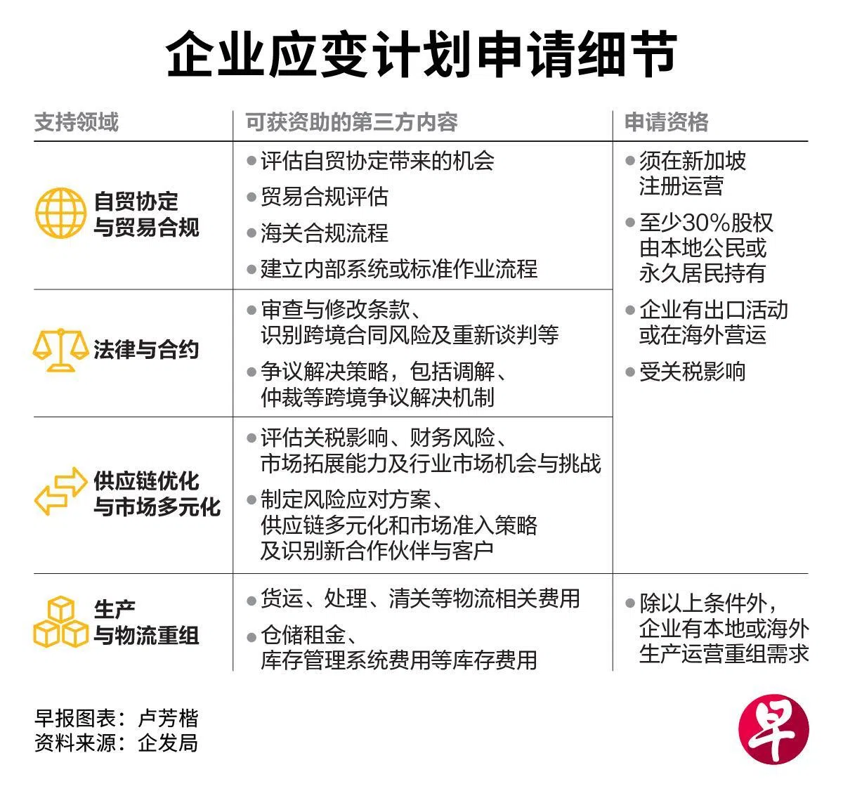 企业应变计划为本地中小企业提供最高50%、非中小企业最高30%的咨询费用支持,每家公司最高可获10万元,用于聘请第三方顾问,协助评估供应链、贸易合规及自由贸易协定的运用等事项。