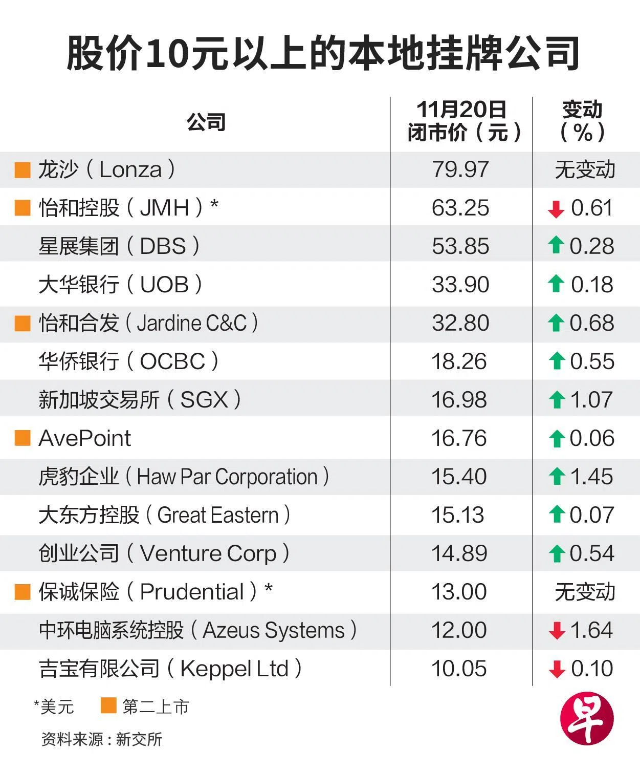 根据截至星期四(20日)的闭市价,本地共有14只股票的股价高于10元。除了三大银行股,还包括第二上市的瑞士医药公司龙沙(Lonza)、保险巨头保诚保险(Prudential)、怡和控股(JMH)等,以及虎豹企业(Haw Par)和创业公司(Venture Corp)等中市值股。