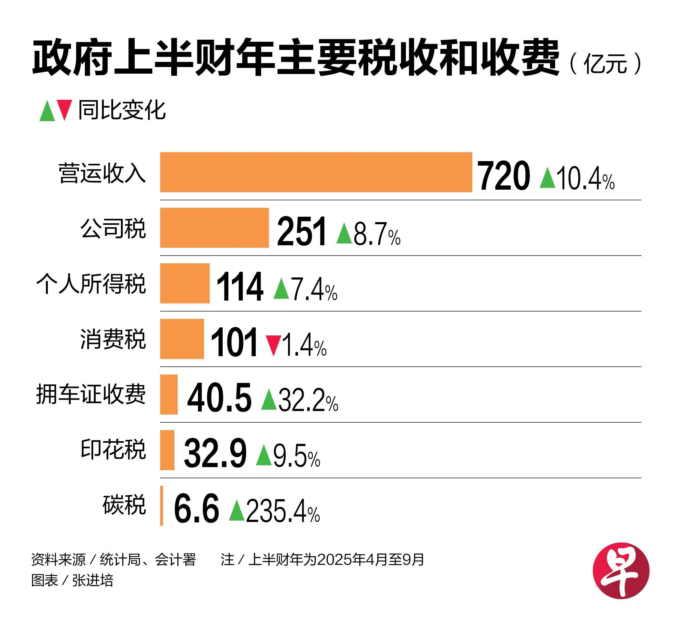 尽管4月美国关税解放日带来诸多不确定因素,我国政府上半财年营运收入仍增长10.4%,达720亿元,已占全年预算的近六成。