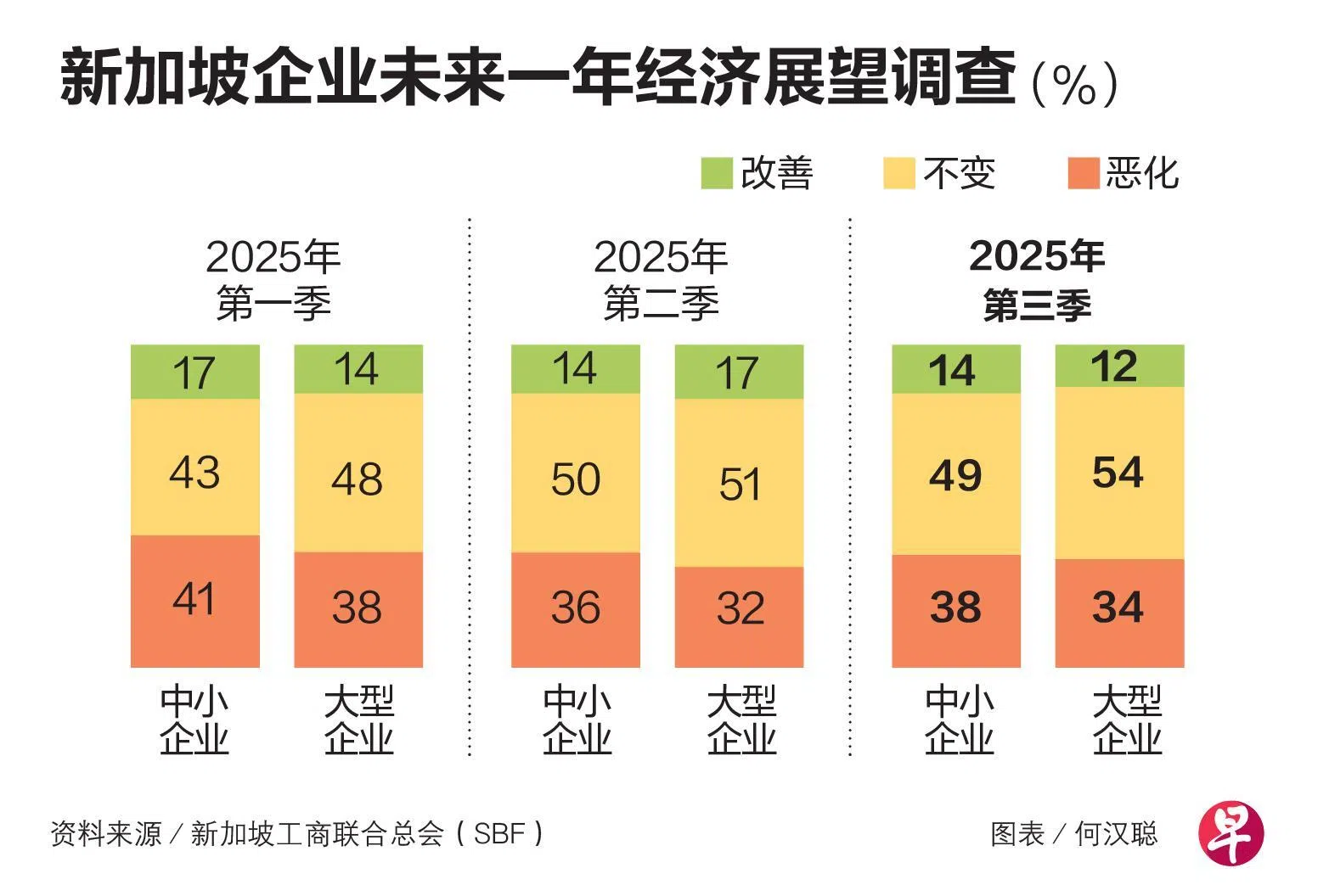 其中,中小企业对未来12个月新加坡经济的展望更显消极,有38%预计经济将恶化,高于上一季度的36%;大型企业有34%预期经济下行,也比上一季度的32%来得多。