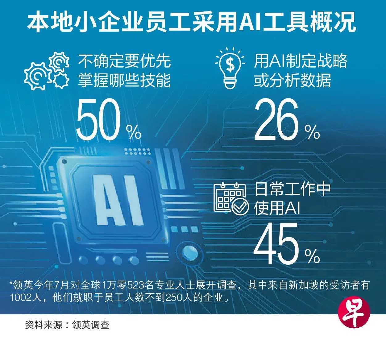本地中小企业在人工智能(AI)的使用率仍有提升空间,仅有26%的员工将AI用于制定战略或分析数据等关键任务,不到一半的员工在日常工作中使用AI。