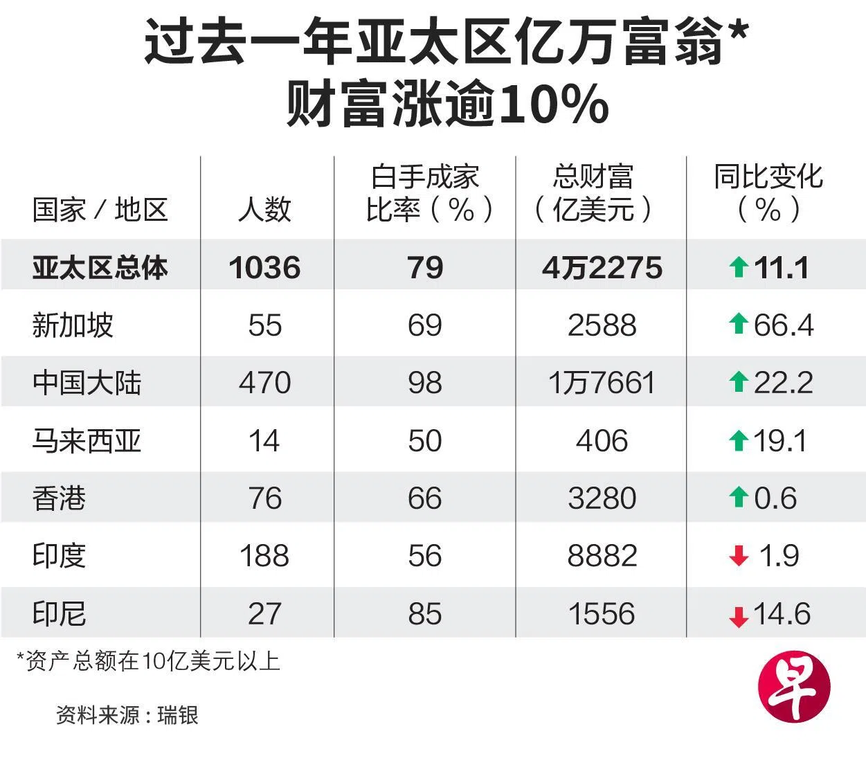 在亚太其他市场方面,中国大陆亿万富翁的财富增长22.2%,马来西亚上升19.1%,香港则仅微增0.6%。