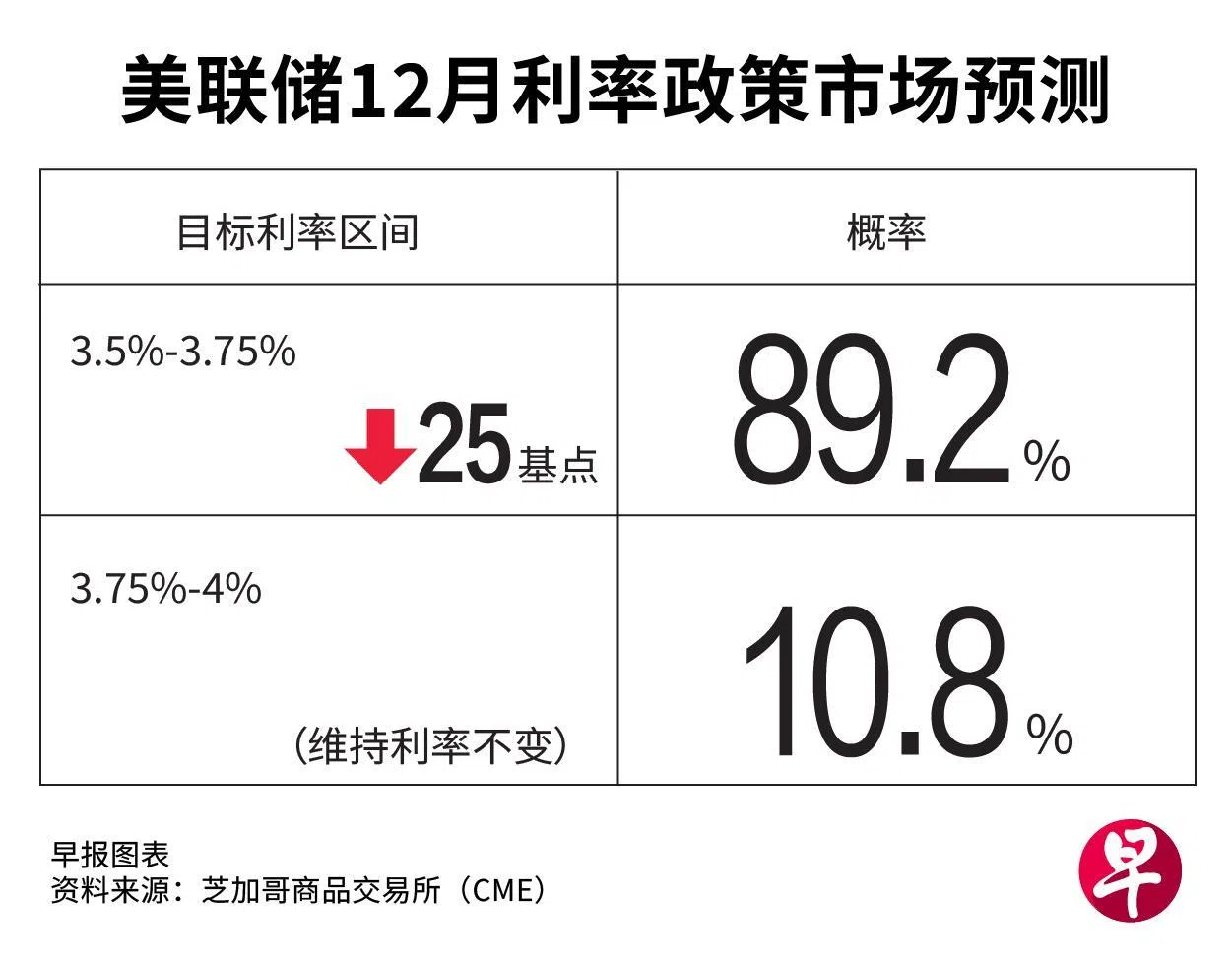 芝加哥商品交易所(CME)的FedWatch工具显示,市场押注美联储12月降息25个基点的概率目前进一步增至89.2%,维持不变的概率则下降至10.8%。